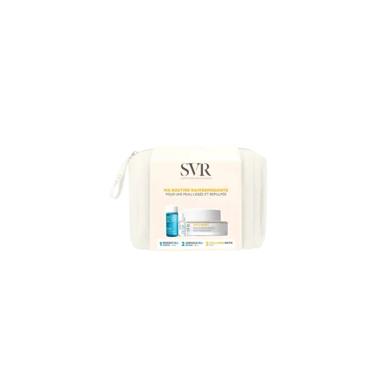 La Trousse Ma Routine Raffermissante SVR propose un rituel complet pour hydrater, apaiser et raffermir votre peau. Enrichie en vitamine B3, acides hyaluroniques et collagène végétal, elle lutte contre les signes du vieillissement tout en renforçant la barrière cutanée. - [B3] Essence Hydra 30 ml : Offrez à votre peau une hydratation profonde grâce à cette essence enrichie en vitamine B3. Parfaite pour les peaux déshydratées, elle apaise et lisse la peau, tout en préparant l’épiderme à recevoir les soins suivants. Une hydratation continue pendant 24 heures pour une peau plus douce, souple et résistante, jour après jour. - [B3] Ampoule Hydra 10 ml : Offrez à votre peau un sérum ultra-concentré en niacinamide (vitamine B3) pour un boost d’hydratation instantané. Enrichie en 3 types d’acides hyaluroniques, cette ampoule agit en profondeur, repulpant la peau et renforçant sa barrière. Son effet léger et non collant est idéal pour atténuer les premiers signes de l’âge. - [COLLAGEN] Biotic Crème 50 ml : Régénérez votre peau avec cette crème enrichie en collagène végétal. Sa texture innovante et sensorielle redonne de l’élasticité à la peau tout en lissant les rides et ridules. Chaque application illumine le teint et raffermit la peau pour un effet jeunesse visible. Une trousse élégante et pratique : La trousse incluse vous permet d’emporter vos soins partout avec vous. * Bienfaits principaux : - Hydratation intense et durable - Atténuation des signes visibles de l’âge - Renforcement de la barrière cutanée - Redonne élasticité et éclat à la peau