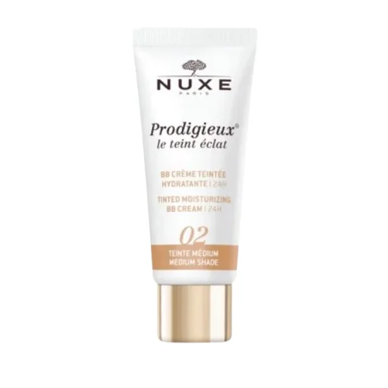 NUXE Prodigieux BB Crème Teintée Hydratante unifie instantanément le teint tout en offrant une hydratation continue pendant 24 heures. Sa texture légère, enrichie en pigments d’origine naturelle, fusionne avec la peau pour un effet « bonne mine » immédiat et un fini naturel. Non comédogène, cette crème permet une couvrance modulable et garantit une hydratation longue durée.