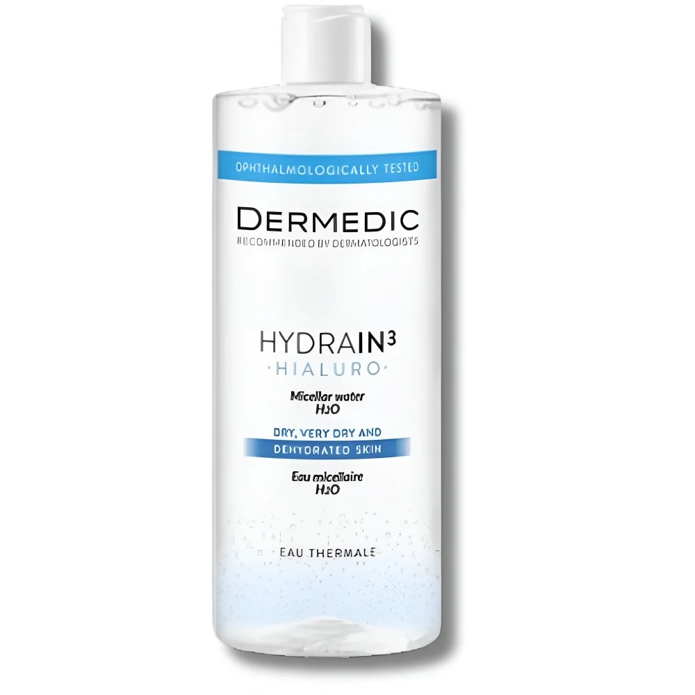 L'eau micellaire Dermedic Hydrain3 Hypoallergénique est une eau nettoyante demaquillante hydratante enrichie en Eau thermale, acide hyaluronique, Hydroveg VV, glycérine, allantoïne, urée Dermedic Hydrain3 eau micellaire permet d'enlèver le maquillage et toutes les impuretés, laissant la peau fraîche et propre Parfaite pour Adoucir et maintenir l’hydratation de la couche cornée de la peau Ne pas obstruer les pores de la peau et ne laisse aucune pellicule sur la peau N'irrite pas les yeux Testé ophtalmologiquement