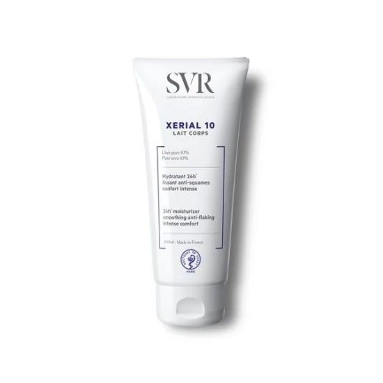 SVR Xérial 10 est un lait pour le corps qui élimine efficacement les cellules mortes et hydrate intensément pendant 24h. Ce dernier est anti-squames. Enrichi en beurre de karité et allantoïne, ce lait corps apaise, nourrit et protège la peau. En utilisant Xérial 10 lait corps votre peau deviendra lisse et douce. Grâce à se texture fine, ce lait corps est très facile à étaler. Sa composition lui permet d'être utiliser en parallèle avec un traitement dermatologique desséchant.