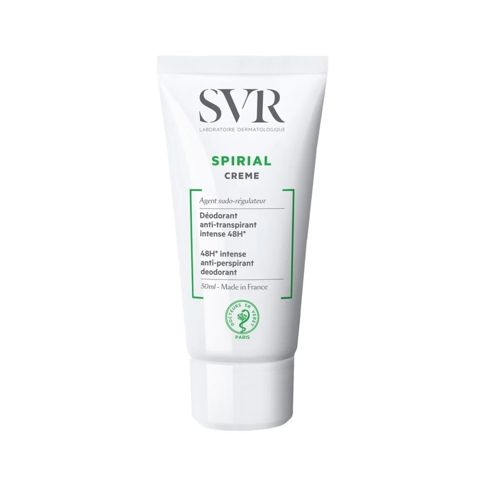 SVR Spirial déodorant est une crème soin anti-transpirant haut tolérance. Ayant un sudorégulateur intense, Spirial Crème prévient la formation d'odeurs au niveau des aisselles, des pieds, des mains, des plis et du visage de mais aussi soigne la transpiration normale soit-elle ou excessive. Sa texture ultra légère ne colle pas et ne tache pas. Sans alcool, ans conservateur et sans parfum ce dernier peut être utilisé également par des enfants.
