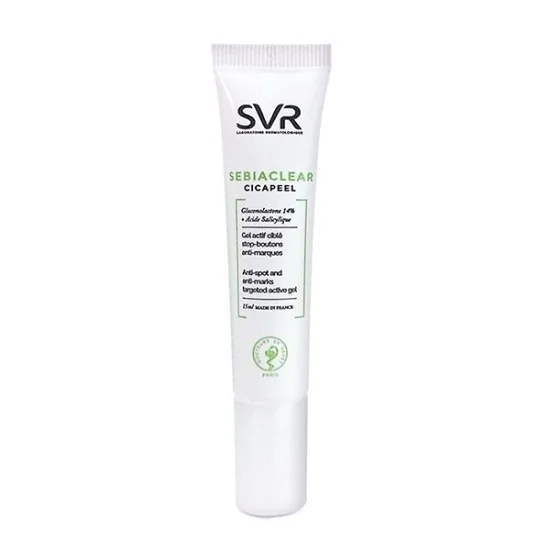 SVR SEBIACLEAR Cicapeel est un gel actif ciblé. Destiné pour peaux sensibles à tendance acnéique afin de stoper les boutons pendant 24h. Ce gel permet de purifier, éliminer et assécher les imperfections et les rougeurs localisées en 24h. purifie. Il a une action renforcée qui réduit et prévient les marques. Testé sous contrôle dermatologique : sans paraben.