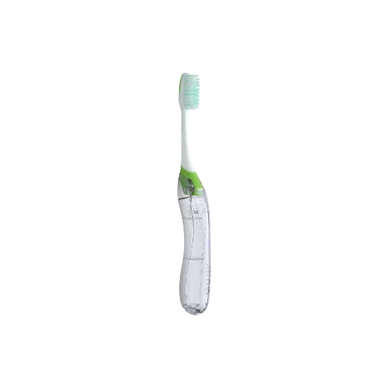 GUM BROSSE A DENT VOYAGE TRAVEL 158 Hygiène dentaire en voyage ou au bureau. Adulte. Brosse à dents de voyage, pour adulte, 4 rangs, avec protection antibactérienne des brins. Repliable dans un étui protecteur en plastique translucide, aéré par 2 trous. Design en tryptique permettant de ranger la tête de la brosse dans le manche Manche doté de trous d'aération permettant à l'excès d'humidité de s'échapper et de garder la brosse propre Brins recouverts de Chlorhexidine, agent anti-bactérien de référence, permettant de les conserver propres entre chaque utilisation.