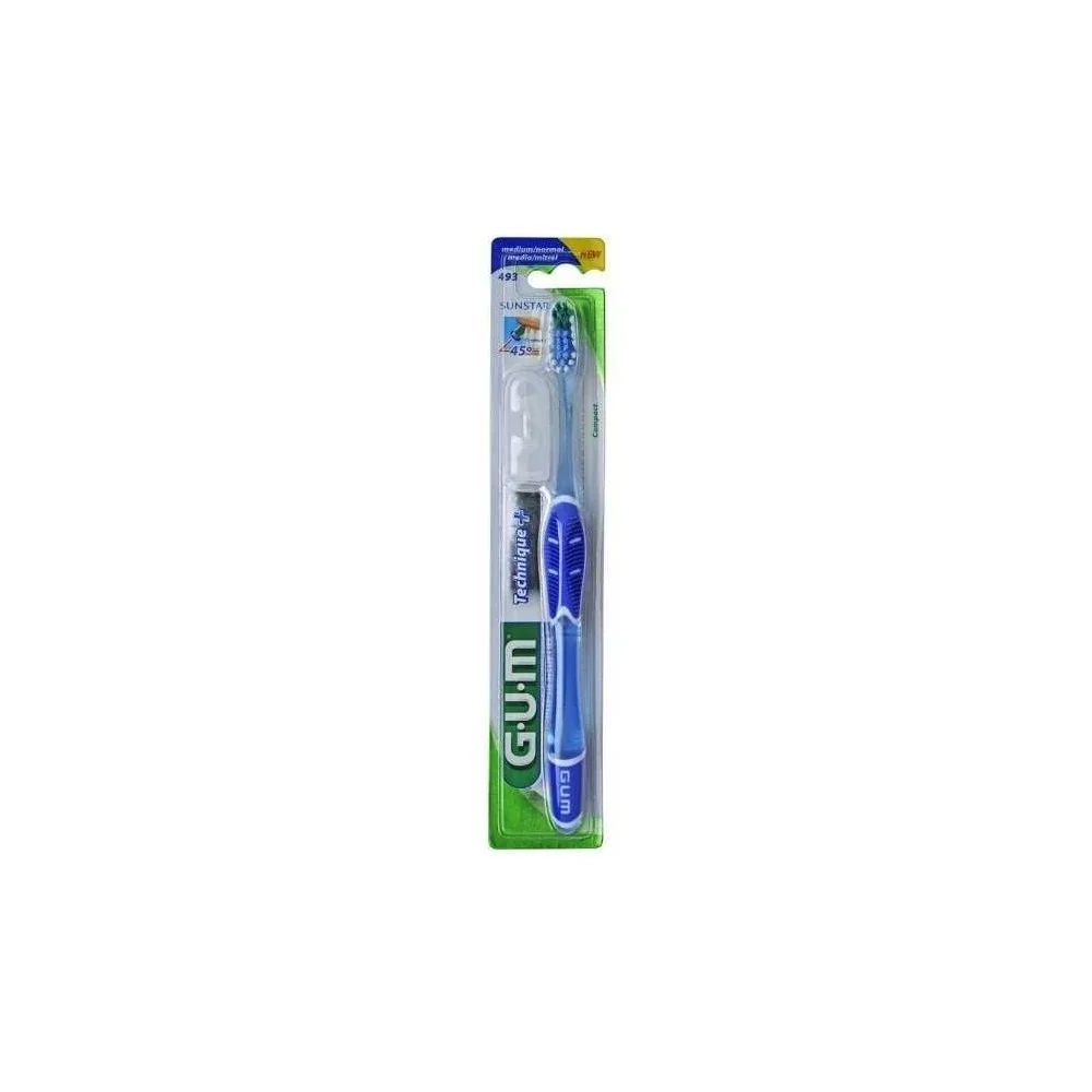 GUM Brosse à Dents TECHNIQUE Compact Médium 493 GUM Brosse à Dents TECHNIQUE Compact. Manche Quad-Grip la conception de ce manche (en losange) oriente tout naturellement les brins selon l’angle idéal de brossage 45° Pour apprendre et adopter le geste parfait du brossage à 45°. Coupe en dôme : les 2 rangées centrales surélevées permettent d’émiminer efficacement la plaque dentaire, en particulier au niveau du sillon gingivo-dentaire. Manche ergonomique : bi-matière (polypropylène/élastomère), assure une excellente prise en main et procure un confort d’utilisation pour un brossage plus efficace.