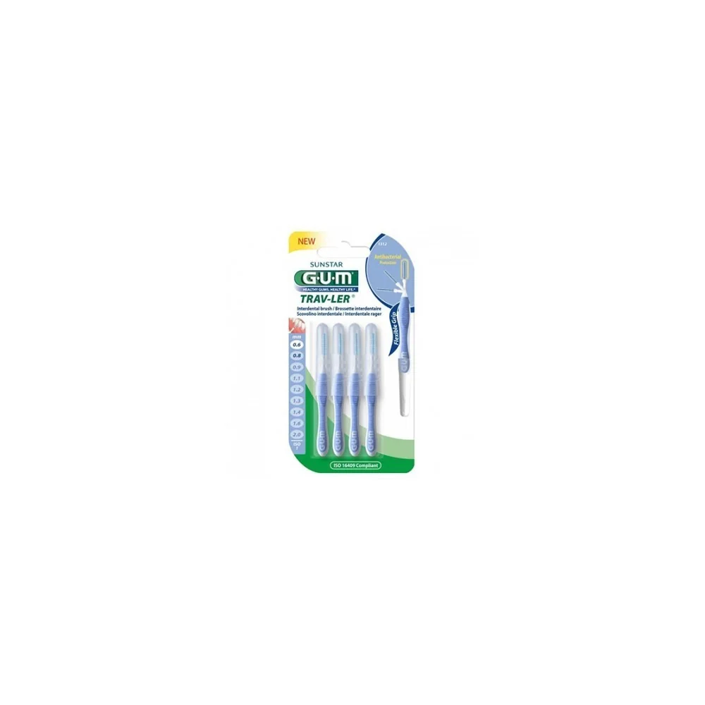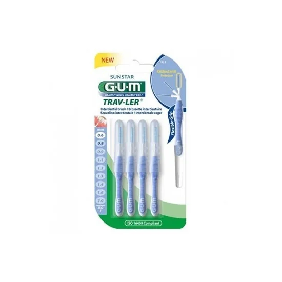 GUM BROSSETTE 1312 INTERDENTAIRE x4 Protection antibactérienne Manche flexible Elimination professionnelle de la plaque pour une santé des gencives otpimum jusqu'à 25% de plaque supplémentaire éliminée, grâce à ses brins de forme triangulaire confort d'utilisation et contrôle améliorés grâce à son manche flexible, muni d'un grip anti-dérapant et d'un cou coudable, facilitant l'accès aux dents postérieures les brins brevetés sont imprégnés de chlorhexidine, agent antibactérien de référence, permettant de maintenir la brossette propre entre chaque utilisation Utiliser avec des gestes modérés Ne pas forcer dans les espaces interdentaires serrés Rincer la brossette après chaque utilisation Changer de brossette après une semaine d'utilisation