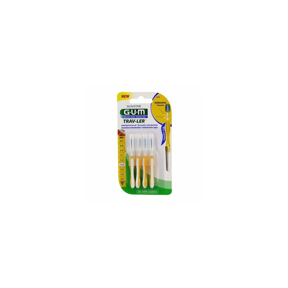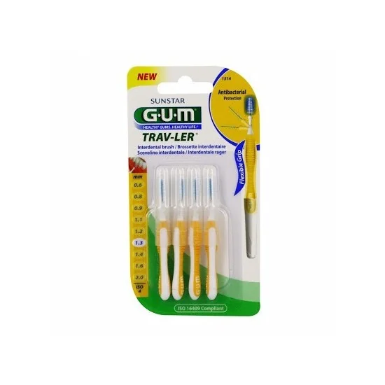 GUM BROSSETTES 1514 TRAV-LER 4 BROSSETTES DE VOYAGE 1.3 MM Lot de 4 brossettes interdentaire extrafine de voyage. Hygiène dentaire, nettoyage des espaces interdentaires. Constituée d'une hampe métallique. Brins imprégnés d'un antiseptique. Se présente avec un fermoir de voyage, pouvant être employé pour allonger le manche.