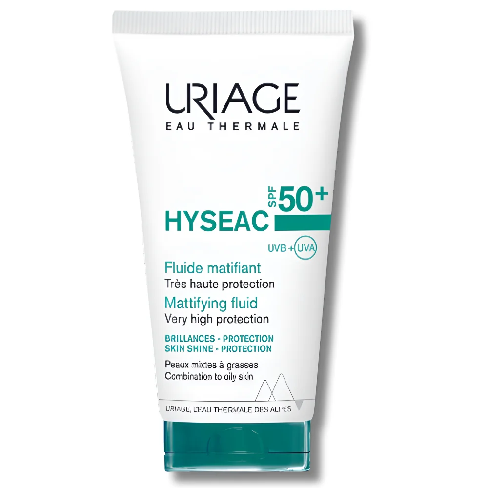 Fluide solaire Uriage Hyséac SPF50+ pour peaux grasses et à tendance acnéique. Haute protection UVA/UVB, fini mat, texture légère non grasse, résistant à l’eau et adapté à un usage quotidien.