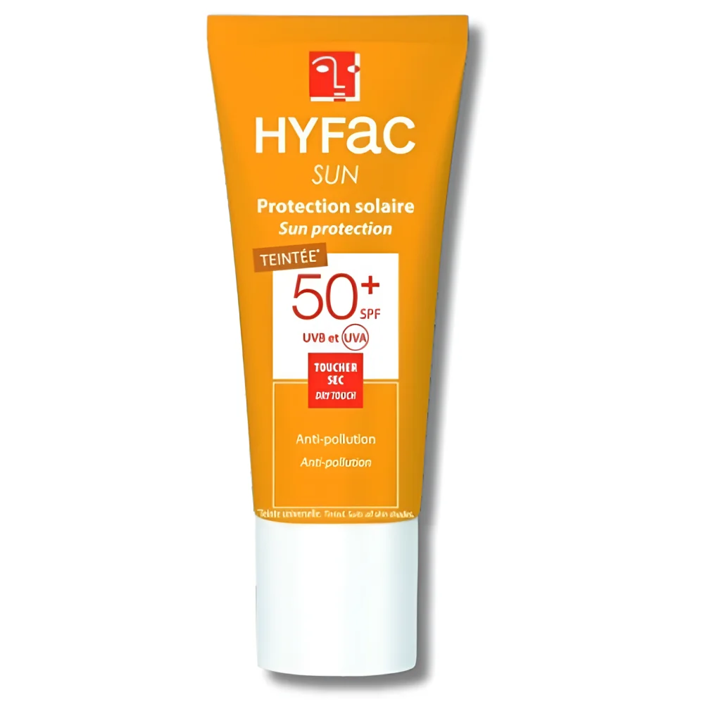 Hyfac Sun SPF50 teinté protège les peaux sensibles du visage contre le soleil, la lumière bleue et la pollution avec un toucher sec et sans traces blanches.