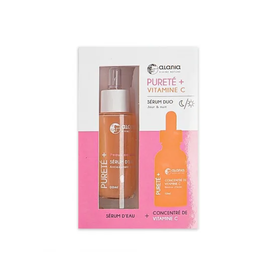 ALANIA PURETE+ VITAMINE C SERUM DUO se compose de : Le sérum d’eau PURETE + (30mL) illumine et nourrit votre peau en profondeur. Sa texture légère apporte lumière et hydratation à votre teint. Le concentré de VITAMINE C (12mL): Le booster d’éclat PURETE + lifte et illumine votre peau. Sa formule concentrée en vitamine C permet un effet bonne mine instantané et un résultat durable. BIENFAITS : Nourrit, illumine et répare la peau abîmée Antioxydant, skin booster et tonifiant Lutte contre le vieillissement cutané, effet liftant Effet bonne mine instantané avec un effet durable