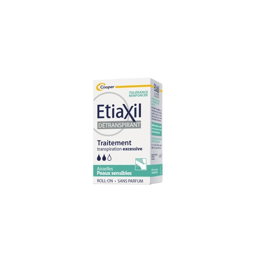 Le roll-on Etiaxil Détranspirant Peaux Sensibles Aisselles est le produit contre la transpiration le plus vendu en pharmacie1 ! Ce produit a été conçu pour traiter efficacement la transpiration excessive des aisselles, tout en respectant les peaux sensibles. Une formule à la tolérance renforcée grâce au complexe protecteur CPx limite le risque d’irritations cutanées et maximise le confort des peaux sensibles Son efficacité prouvée cliniquement2 permet de stopper la transpiration 3 à 5 jours et assure ainsi un contrôle total, anti-humidité et anti-odeur. Appliqué sur les aisselles, le produit permet de mettre au repos les glandes sudoripares, qui cessent alors de produire de la sueur pendant quelques jours. Sans parfum, ce produit est compatible avec l’usage d’un déodorant ou d’un parfum au quotidien.