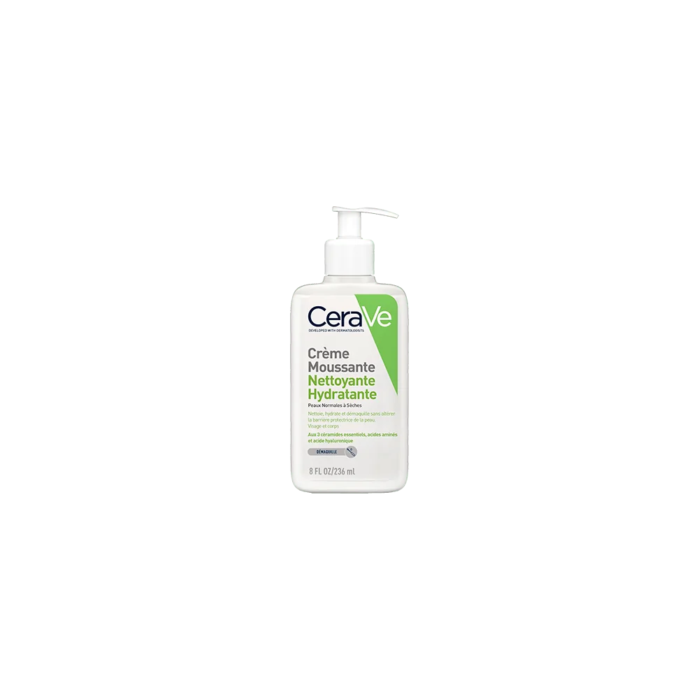 CERAVE CREME MOUSSANTE NETTOYANTE HYDRATANTE 236 ML : Formulée à partir de tensios-actifs doux à base d'acides aminés, la Crème Moussante Nettoyante Hydratante démaquille efficacement, nettoie en douceur et hydrate les peaux normales à sèches. Enrichie aux 3 Céramides essentiels, à l'acides hyaluronique et aux acides aminés sa formule élimine les impuretés, la pollution et même le maquillage longue tenue, tout en hydratant et restaure la barrière cutanée de la peau. Technologie brevetée MVE pour une diffusion prolongée des actifs dans la peau et hydrater en continu pendant 24h. Texture crème en mousse onctueuse et enveloppante. Formule visage et yeux douce au Ph physiologique. Testée sous contrôle ophtalmologique. Ne pique pas les yeux. Sans parfum. Hypoallergénique. Non-comédogène. Démaquille efficacement sans laisser de résidus, même le maquillage longue tenue ( visage, yeux et lèvres) : 100% Nettoie efficacement les impuretés, la saleté et la pollution : 100% Agréable à utiliser : 98% Facile à rincer : 98% N'irrite pas la peau et nettoie en douceur : 98% Laisse une peau douce et hydratée :98% Test consommateurs, n = 55 femmes, âge 19 à 59, peau sensible et peau sèche Trois céramides essentiels pour aider à maintenir la peau hydratée et à restaurer la barrière cutanée. La Technologie MVE permet d’encapsuler les actifs et de les diffuser dans la peau en continu. Cela permet de restaurer la barrière cutanée et de l’hydrater tout au long de la journée après seulement une application