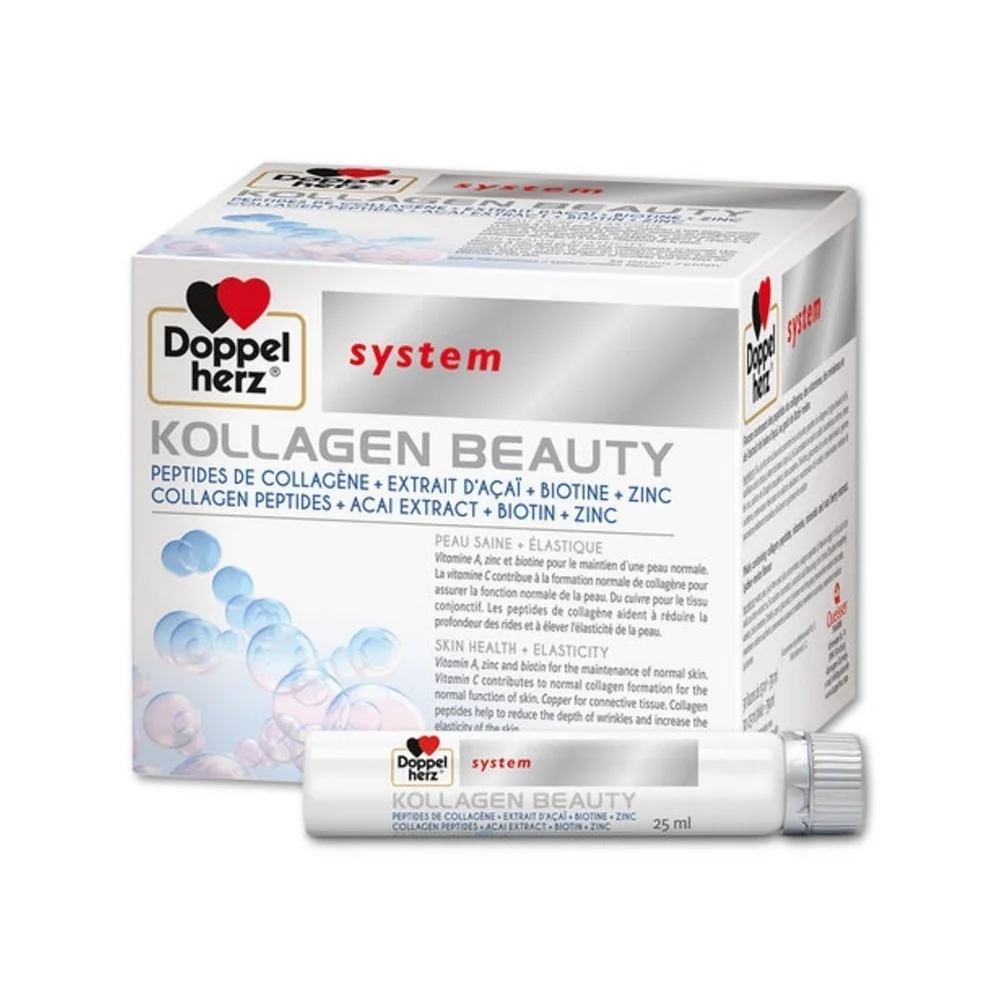 DOPPELHERZ KOLLAGEN BEAUTY est un système de traitement de 30 ampoules qui s'appuie sur les peptides du collagène pour renforcer votre peau. Le système Doppelherz KOLLAGEN BEAUTY est encore renforcé par son mélange unique de vitamines et minéraux antioxydants (la vitamine A, le zinc, le cuivre et la biotine), ainsi que d'extrait de baies d’açaï - tous les ingrédients qui favorisent un teint sain pour le visage et le corps. Doppelherz KOLLAGEN BEAUTY est un complément conçu pour une utilisation à long terme. Un effet est visible après environ 4 à 8 semaines. Il soutient la "renaissance" et l'amélioration de la fermeté de la peau grâce à ses ingrédients de collagène de haute qualité. La consommation orale de collagène peptides a un effet positif sur l’apparence. Les rides et les ridules du visage sont atténués. L’élasticité de la peau est améliorée. De plus, un effet de traitement des cicatrices est obtenu.