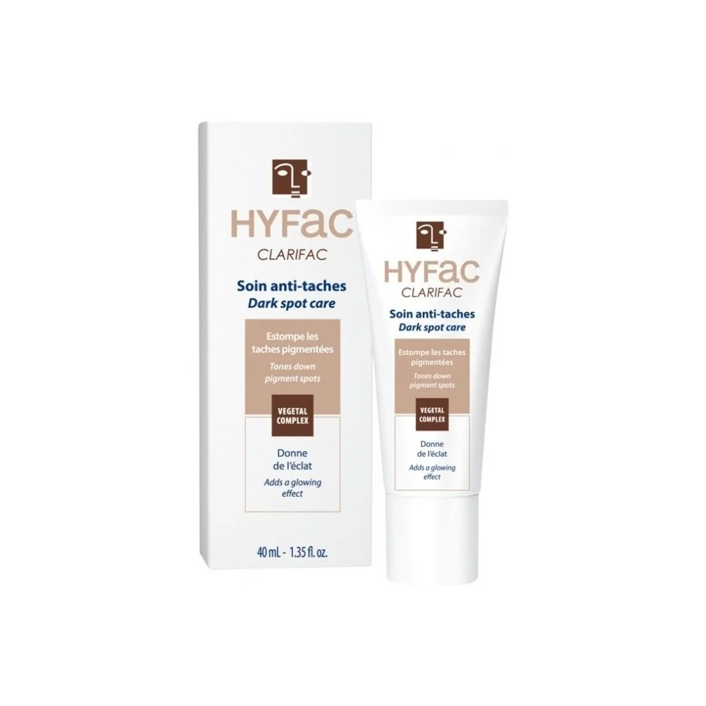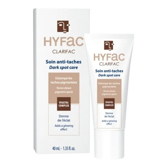 Le soin anti-taches Clarifac de la marque Hyfac est un soin pour le visage destiné aux peaux qui présentent des taches pigmentées dues à l'exposition au soleil, à l'âge, à un traitement médicamenteux ou à des cicatrices résiduelles d'acné. Ce soin sous forme de crème permet d'estomper les taches, d'éclaircir le teint tout en apportant la juste dose d'hydratation à la peau et en la protégeant des rayons UV grâce à son SPF 30. L'action anti-taches du soin Clarifac repose sur l'association de deux actifs qui vont cibler les trois étapes de la mélanogénèse, qui correspond au processus de synthèse de la mélanine, élément responsable de la coloration de la peau. On retrouve ainsi dans la composition de ce soin de l'extrait d'algue Dictyoptéris membranacea, un composant qui inhibe et retarde la synthèse de la mélanine puis l'empêche de remonter jusqu'à la surface de la peau, ce qui entraînerait l'apparition de taches. Ce soin anti-taches Hyfac contient également de l'extrait de lys blanc, reconnu pour ses vertus éclaircissantes au niveau du grain de peau et son action sur la réduction des taches pigmentaires. Doté d'une texture légère qui pénètre rapidement dans la peau, le soin anti-taches Clarifac redonne de l'éclat au teint et protège la peau au quotidien contre l'apparition de nouvelles taches.