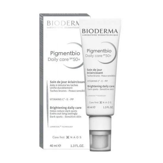 Taches brunes, peaux sensibles Type de peau : Peau sensible Texture : Crème Indice de protection : SPF 50 + Bioderma Pigmentbio Daily Care SPF 50+ est un soin de jour éclaircissant, conçu spécifiquement pour les peaux sensibles. Plus le temps passe, plus la peau est susceptible de laisser apparaître les stigmates qui témoignent de notre vie. En effet, le vieillissement cutané dû à l'âge s'accompagne de tout un cortège de signes visibles, parmi lesquels, les taches brunes, qui apparaissent notamment sur le visage et le corsage. Le soleil porte également sa part de responsabilité. En effet, l'exposition au soleil contribue au vieillissement prématuré de la peau et à l'apparition de ces taches. Ces dernières correspondent à une production excessive de mélanine. Ainsi, pour prévenir leur apparition, une très haute photoprotection est requise