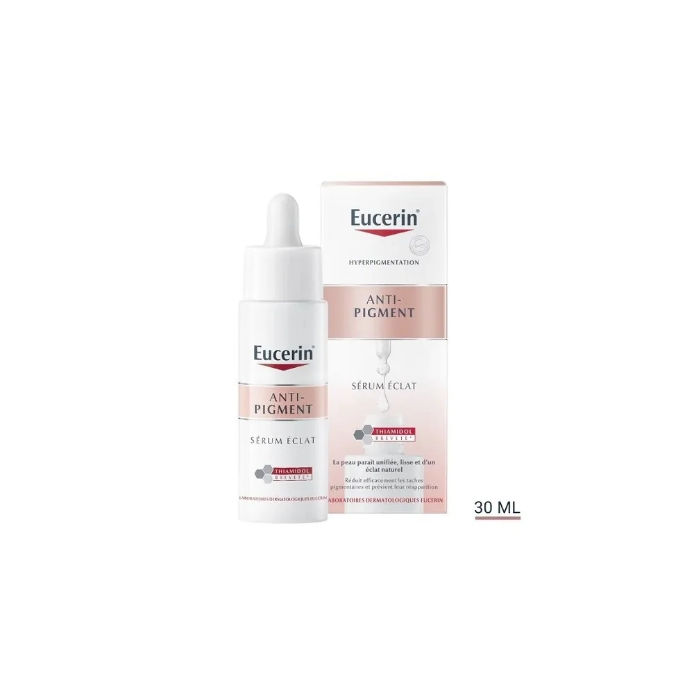 un sérum ultra léger, testé cliniquement, contient du Thiamidol pour réduire les taches brunes et prévenir leur réapparition. Adapté à tous les types de peau, ce sérum pénètre rapidement et aide la peau à paraître unifiée, lisse et d'un éclat naturel. Le Sérum Éclat ANTI-PIGMENT d'Eucerin combine des ingrédients actifs puissants qui agissent de différentes manières pour favoriser l'éclat de votre peau et réduire les taches brunes : Le Thiamidol : un ingrédient efficace et breveté qui agit à la source des taches brunes, cliniquement prouvé , il réduit et prévient l’apparition des taches brunes grâce à une utilisation régulière. L'Acide Hyaluronique : une des substances hydratantes les plus efficaces de notre peau qui l'aide à attirer et à retenir l'humidité, tandis que la glycérine est un humectant qui aide également notre peau à attirer et à retenir l'eau, offrant ainsi une hydratation et un soin durables. Ensemble, ces ingrédients permettent à votre peau de bénéficier de l'hydratation et des soins dont elle a besoin pour obtenir un bel éclat..