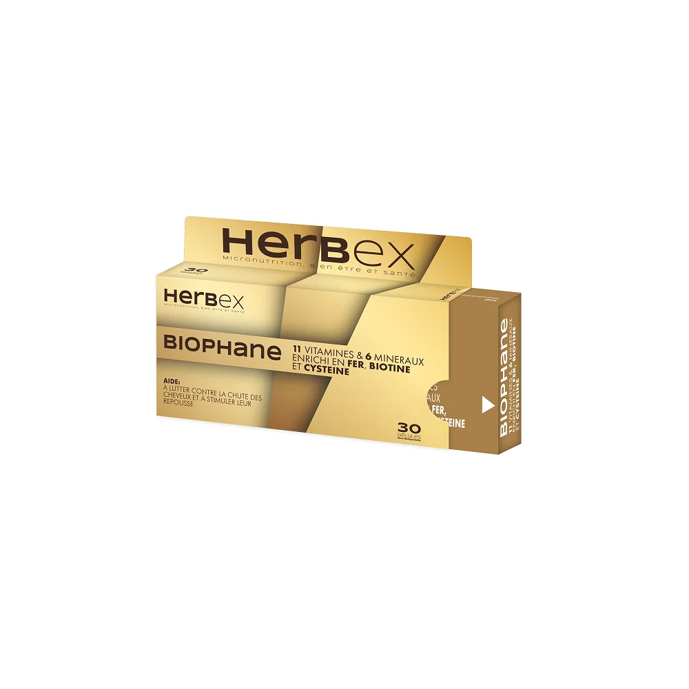 HERBEX BIOPHANE aide à lutter contre la chute des cheveux et à stimuler leur repousse. HERBEX BIOPHANE est composé de plusieurs micro-nutriments tels que: La cystéine , la vitamine B8 ( Biotine ), le zinc, le fer et de nombreuses vitamines (D3, B2, B3, B5, B6, B8, B9, C et E) . Le zinc chelaté à la glycine, agit sur la 5α-réductase, enzyme responsable de la chute capillaire pour lutter contre la perte progressive des cheveux. L’acides aminé soufré L-cystéine agit au coeur de la fibre capillaire pour une production optimale de kératine, principal constituant du cheveu. HERBEX BIOPHANE est enrichi en biotine pour aider à maintenir des cheveux normaux . Apportant un réel équilibre de micro-nutriments, HERBEX BIOPHANE nourrit en profondeur le cheveu et permet de: Freiner la chute Renforcer le bulbe stimuler la repousse Après 3 mois de cure, le cheveu gagne en volume, en densité et en résistance. 90 % des personnes interrogées sont satisfaites par la densité, 93% par la résistance et 87% par le volume de leur masse capillaire après leur cure d’HERBEX BIOPHANE.