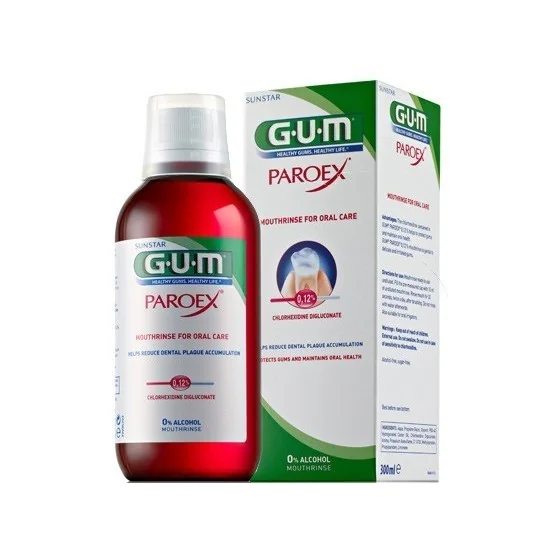 GUM Paroex Mouthwash reduces plaque formation and gum problems and improves the health of irritated gums. For both specific and general uses. Recommended use of GUM Paroex plaque control mouthwash 0.12%: Up to 2 weeks. 0.12% CHX + 0.05% CPC CHX = Chlorhexidine digluconate which effectively eliminates harmful microorganisms in the form of bacterial plaque and provides long-lasting protection. CPC = Cetylpyridium chloride, an anti-plaque and toxin neutralizing agent for maximum antibacterial protection.