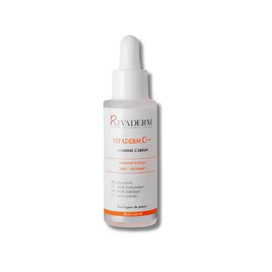 Rivaderm C++ Sérum Vitamine C 30ml est un soin intensif 4 en 1 à haute concentration en actifs antioxydants. Enrichi en vitamine C stabilisée multiforme, il booste l’éclat du teint et protège la peau contre les agressions extérieures. Sa formule associe acide hyaluronique à faible poids moléculaire pour une hydratation en profondeur, acide azélaïque et alpha-arbutine pour unifier le teint et réduire les imperfections, ainsi que le panthénol pour apaiser la peau. La peau est plus lumineuse, lisse et uniforme jour après jour.