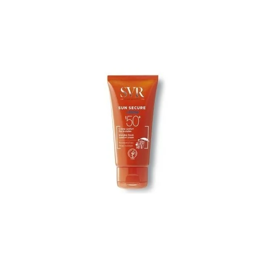 SUN SECURE Crème SPF50+ est une crème confort au fini invisible et au toucher non gras, Elle est adaptée aux peaux normales à sèches. Sa texture velours fond sur la peau et pénètre rapidement. Elle résiste à l'eau, à la transpiration et aux frottements pour une protection optimale. Elle est parfaitement adaptée au visage des peaux hypersensibles au soleil de toute la famille : bébé, enfant, adulte. Une Formule qui convient aux peaux hypersensibles au soleil : Hypoallergénique. Sans paraben. Sans alcool. Sans octocrylène. Parfum sans allergène, non photosensiblisant. Une formule triple action grâce à l'Integral Secure Technology qui cible tous les types de rayons* : • Protection physique en surface : Filtres solaires organiques SPF50+ photostables hautement performants • Bouclier cellulaire : Complexe Liposomal antioxydant [β-carotène + Détoxophane®] • Réparation des dommages cellulaires dus à l'exposition : Niacinamide *L'Integral Secure Technology de SVR offre une protection contre les dommages oxydatifs dus aux UVA, UVB, lumière visible et infrarouges.
