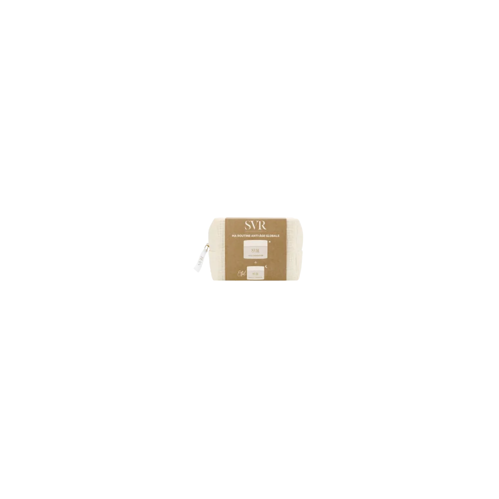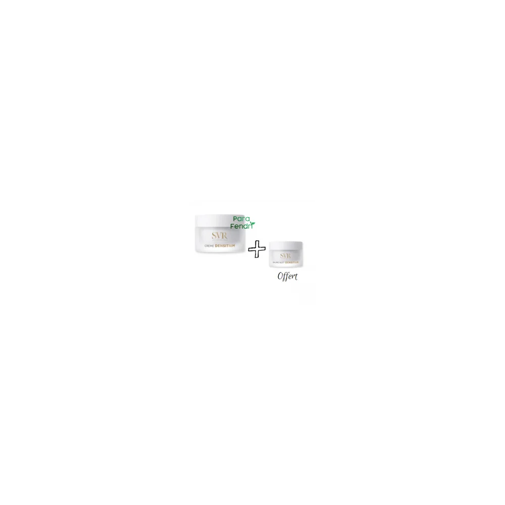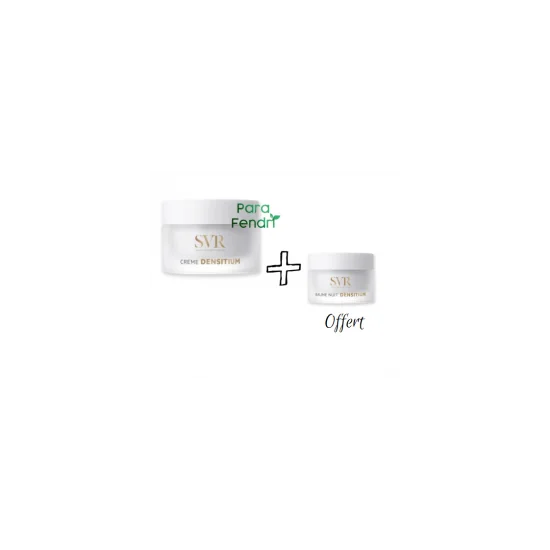 La trousse SVR Densitium, comprenant la Crème Correction Globale 50 ml et le Baume Nuit Réparation Globale 15 ml offert, propose une routine anti-âge complète pour les peaux normales à sèches.