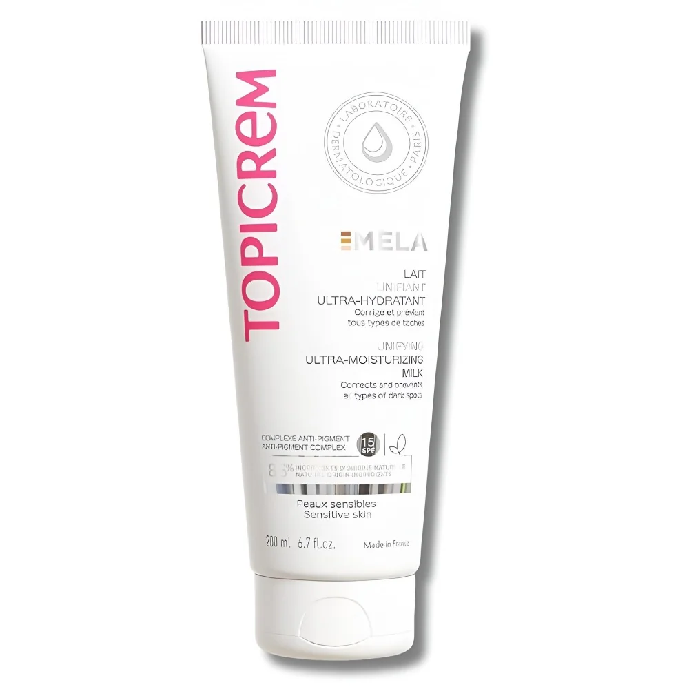 MELA Lait Unifiant Ultra-Hydratant hydrate pendant 24h, corrige les taches pigmentaires et unifie la peau tout en offrant une protection SPF15.