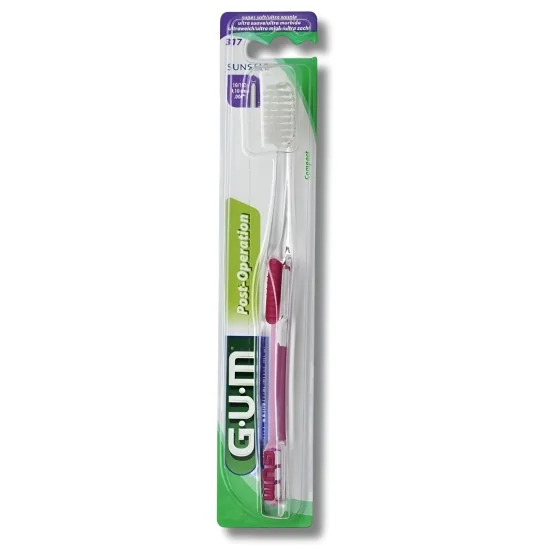 La brosse à dents GUM N°317 est spécialement conçue pour les soins post-opératoires bucco-dentaires. Idéale après une chirurgie, elle est adaptée aux gencives fragilisées grâce à ses brins extra souples 10/100 qui assurent un brossage ultra-doux.
