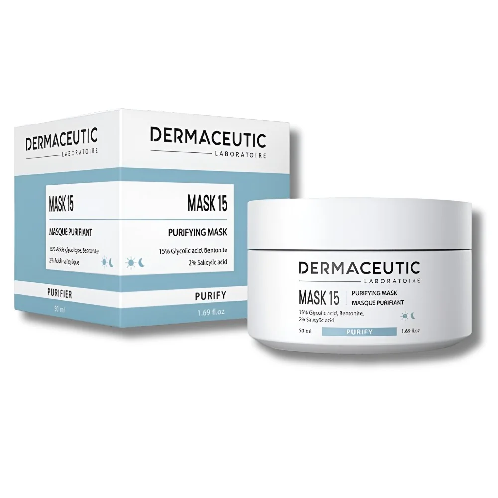 Mask 15 purifie, régule le sébum et affine le grain de peau grâce à l'acide glycolique et à l'argile, idéal pour les peaux grasses à imperfections.