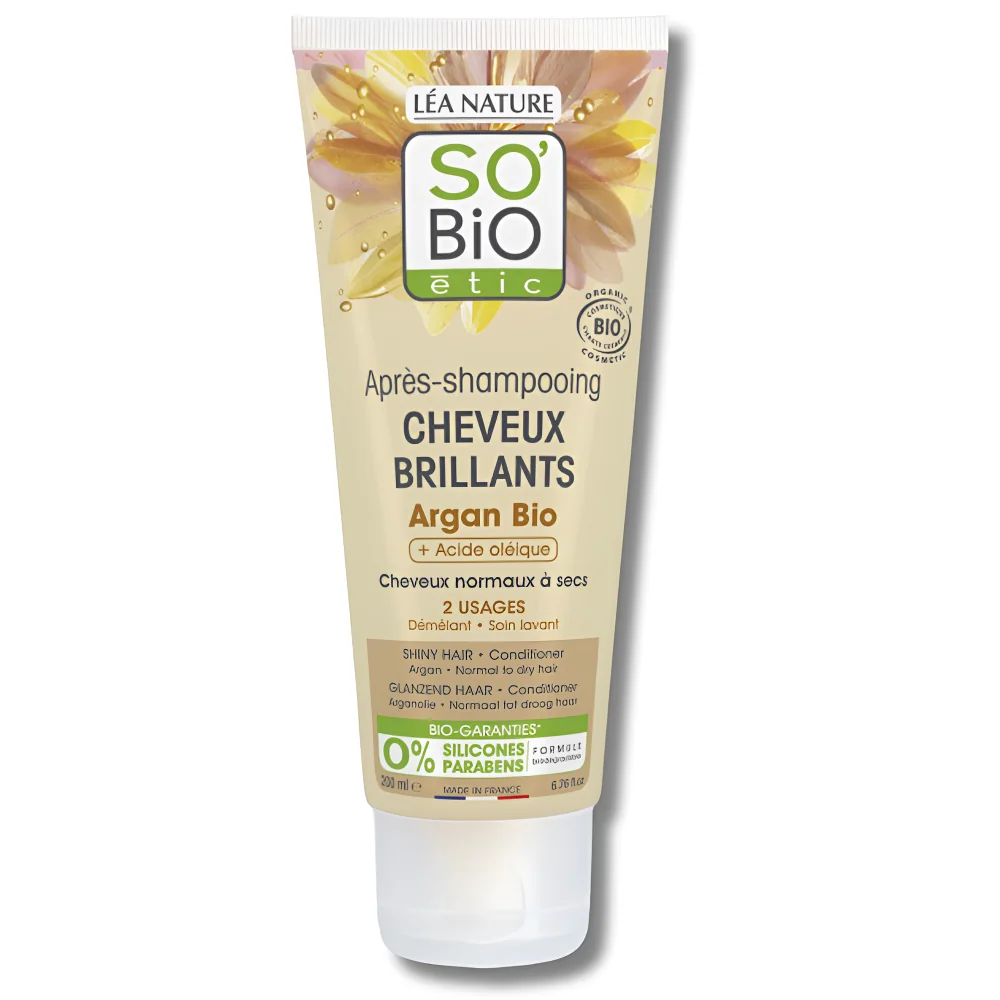 Après-shampooing So’Bio Étic à l’huile d’argan : soin nourrissant et réparateur sans silicones ni parabènes. Enrichi en ingrédients bio, il pénètre la fibre capillaire pour hydrater, renforcer et redonner brillance naturelle aux cheveux secs et abîmés.