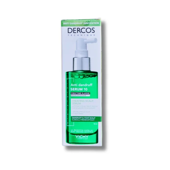 Vichy Dercos Sérum 10 pour cuir chevelu pelliculaire combat les pellicules, l'excès de sébum et les démangeaisons grâce à la piroctone olamine, l'huile de ricin et le niacinamide. Efficace 24h, il apaise et équilibre le cuir chevelu entre les lavages.
