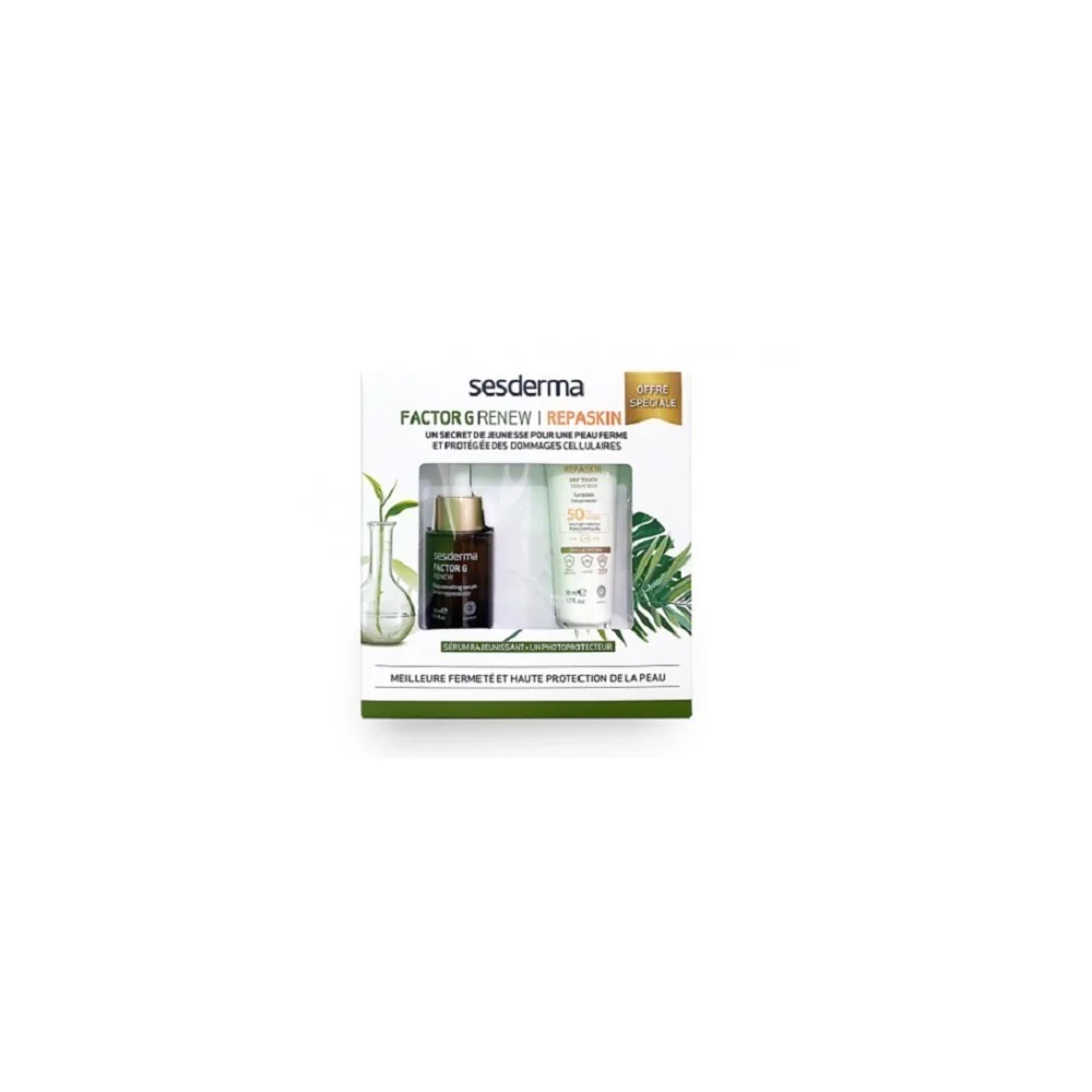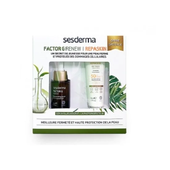 -FACTOR G SERUM 30ml: Sesderma Factor G Renew Serum Rajeunissant est un soin anti-âge puissant indiqué pour régénérer et rajeunir la peau. Ses principes actifs d'origine végétale réactivent les mécanismes naturels de la peau, stimulent le renouvellement cutané et activent la synthèse du collagène et de l'élastine. Sa formule exclusive à base de cellules souches et facteurs de croissance réduit les rides et redonne de la fermeté à la peau. Grâce à leur pouvoir antioxydant et anti-inflammatoire, ils protègent également la peau des agressions extérieures et des irritations. La peau est lissée, adoucie et raffermie. Idéal pour les peaux sensibles et réactives. -REPASKIN ECRAN SOLAIRE SPF50 50ml: Sesderma Repaskin Toucher Soie SPF50+ est un écran solaire à base de filtres chimiques et physiques qui offre une protection optimale à la peau. Grâce à sa texture gel-crème innovante et son toucher soyeux, léger et non gras, Sesderma Repaskin Toucher Soie SPF50+ protège des rayons UVA, UVB et IR-A et calme en réparant les dommages à l'ADN cellulaire. Le photoprotecteur de Sesderma retarde et réduit le photo vieillissement cellulaire. Sesderma Repaskin Toucher Soie SPF50+ est adapté à tous les types de peau exposés à un ensoleillement longue durée et résiste à l'eau.