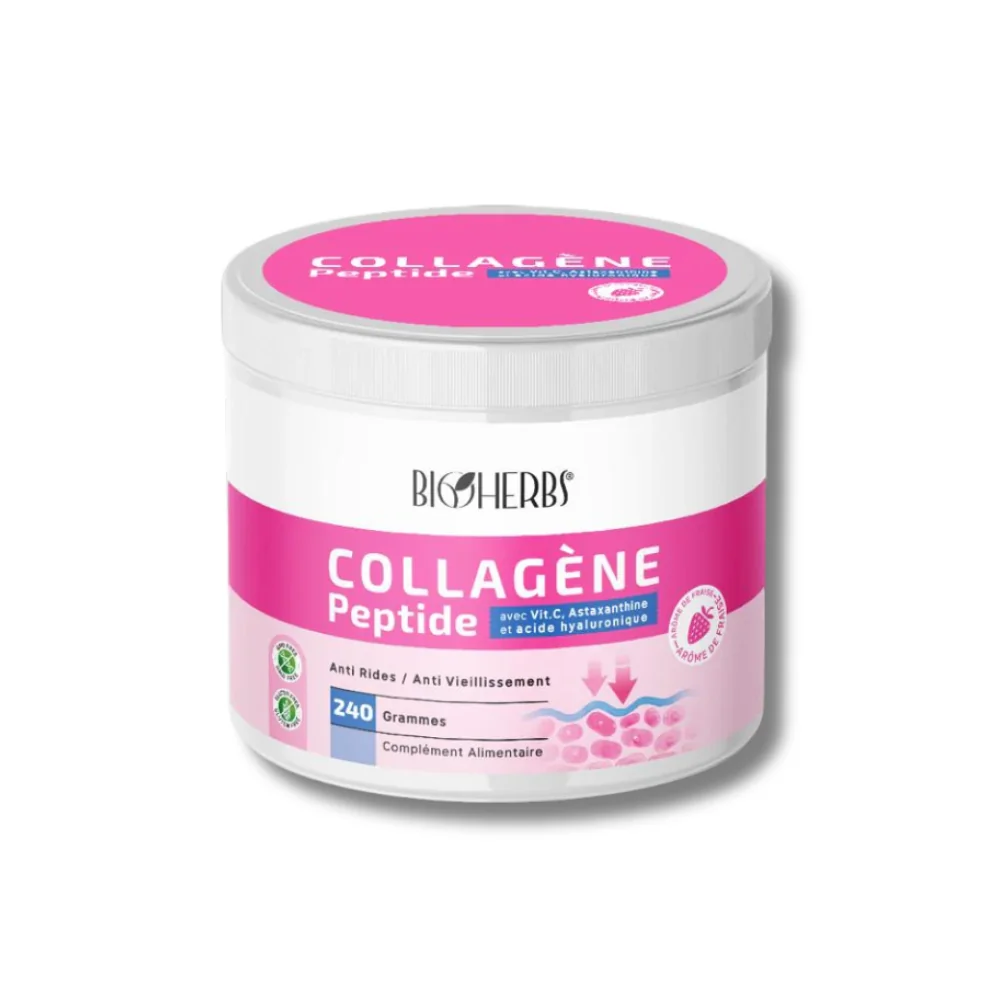 Le Collagène Peptides Poudre Bioherbs 240g hydrate, nourrit et renforce la peau, les cheveux et les ongles grâce à une formule riche en collagène, acide hyaluronique et vitamines.