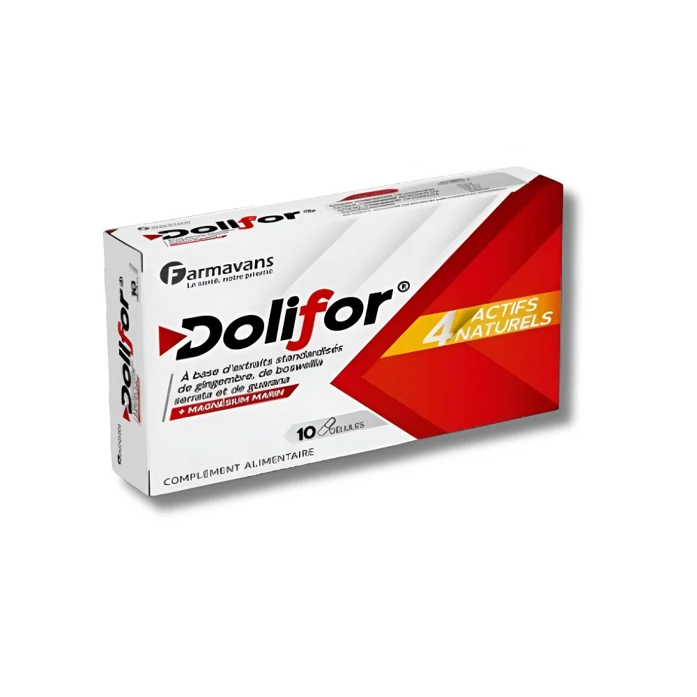 Dolifor est un complément alimentaire qui associe des extraits standardisés de gingembre, de boswellia serrata et de guarana. Il est également enrichi en magnésium, un minéral essentiel qui soutient le bon fonctionnement du système nerveux et des muscles, l'équilibre électrolytique du corps, ainsi que la santé des os et des dents.