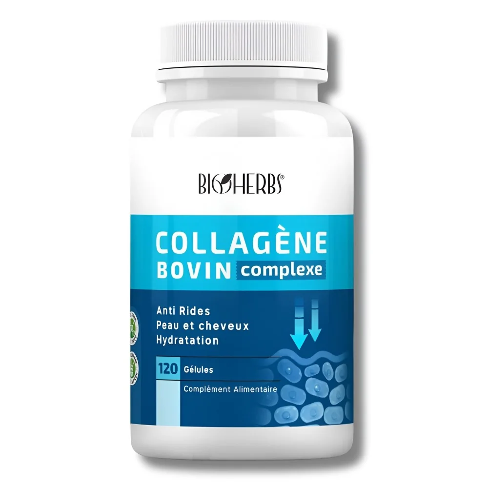 Bioherbs Collagène Bovin Complexe : Aide à maintenir l'élasticité de la peau, réduit l'apparence des rides et favorise la beauté des ongles et des cheveux grâce à une formule riche en collagène hydrolysé, acide hyaluronique et extrait d’acérola.