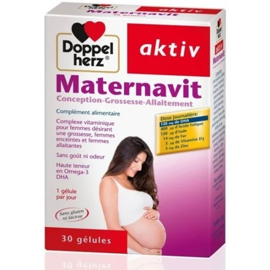 Le complément alimentaire Maternavit est conçu par Doppelherz Aktiv pour accompagner les femmes dès leur désir d‘enfant, pendant la grossesse et jusqu‘à la fin de la période d‘allaitement. Aktiv Maternavit de Doppelhertz contient des vitamines et des minéraux essentiels pour un bon développement du foetus tel que l'Omega 3, l'acide folique, le fer, le calcium, l'iode, le magnésium, le zinc et les vitamines B..
