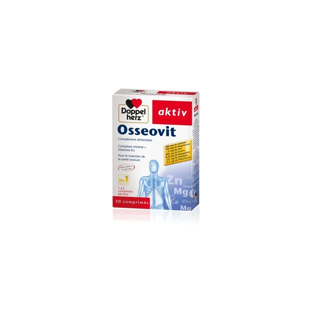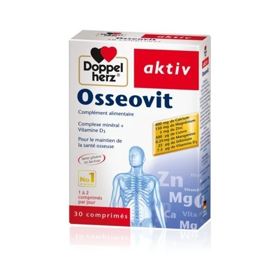 Complexe minéral + Vitamine D3 Pour le maintien de la santé osseuse La combinaison unique de minéraux, d’oligoéléments et de vitamine D3 présente dans les comprimés Doppelherz® aktiv Osseovit est idéale pour supporter la constitution et le maintien d’une ossature et d’une dentition solides. De plus la prise régulière d’Osseovit permet le bon fonc-tionnement du cœur, des muscles et des nerfs.