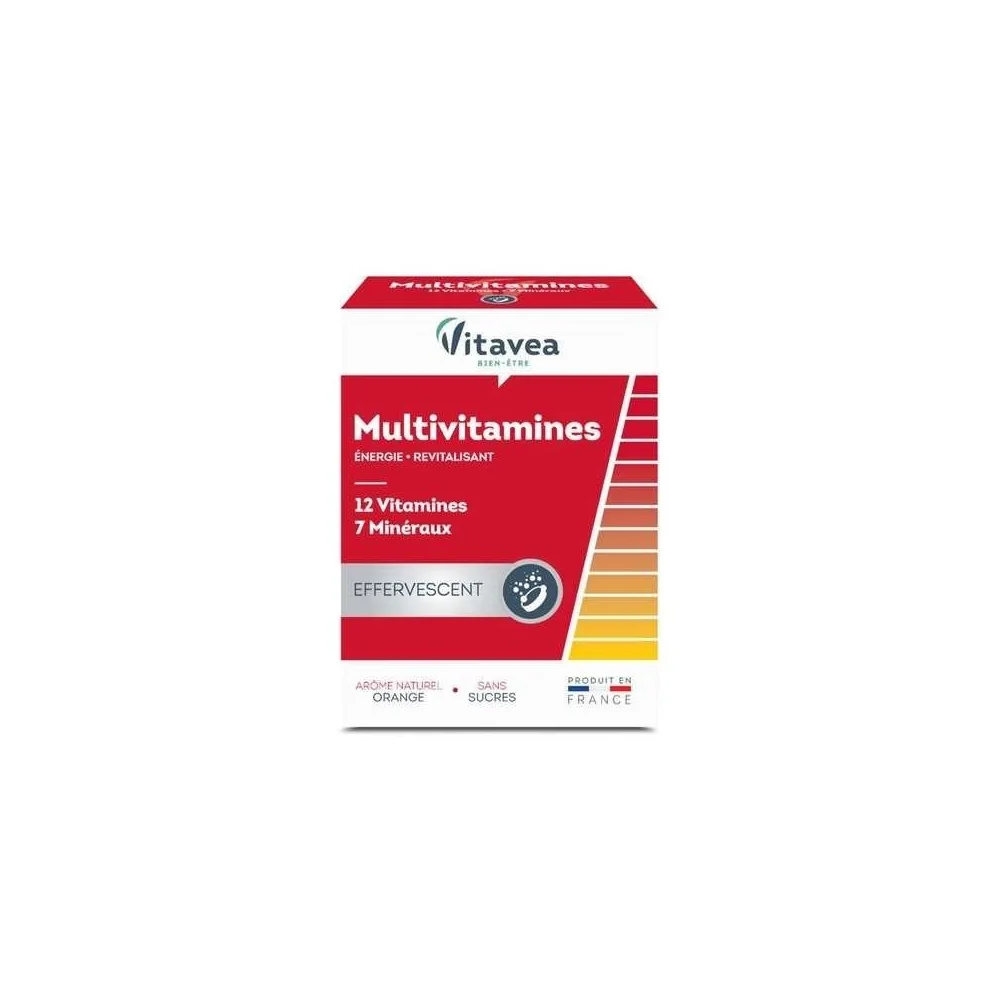 VITAVEA MULTIVITAMINES ENERGIE Aide à faire face aux périodes de besoin accru en énergie grâce à la vitamine C, au fer et au magnésium Recommandé en cas de rythme de vie soutenu et en période de fatigue. Boîte de 24 comprimés : 67,2 g Pour 24 jours VITAVEA MULTIVITAMINES ENERGIE est composée de 12 vitamines et 7 oligo-éléments dont la vitamine C, le fer et le magnésium qui participent à réduire la fatigue et contribuent au maintien de la vitalité. L'extrait de Stévia utilisé est un édulcorant 100% d'origine naturelle et sans calorie, ce qui apporte un petit goût sucré au produit.