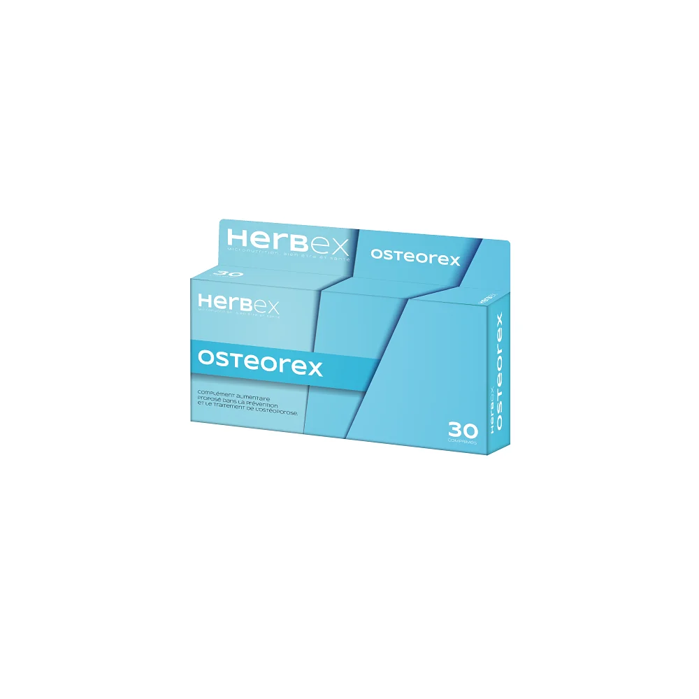HERBEX OSTEOREX est un complément alimentaire proposé dans la prévention et le traitement de l’ostéoporose. Depuis 2012, les autorités de santé européennes (EFSA, European Food Safety Authority et la Commission européenne) se sont prononcées sur certaines allégations santé des aliments et des compléments alimentaires : • les compléments alimentaires apportant au moins 400 mg de calcium par portion peuvent contribuer à réduire la perte de densité minérale osseuse • Les compléments alimentaires apportant au moins 15 microgrammes de vitamine D par portion journalière peuvent contribuer à réduire le risque de chute associé à l’instabilité posturale et à la faiblesse musculaire. • Le cuivre est un oligo-élément indispensable à de nombreuses enzymes. Il intervient notamment dans l’entretien des cartilages, des os. La carence en cuivre est rarissime. Chez l’adulte, elle se traduit par une anémie et de l’ostéoporose précoce • Le manganèse permet de maintenir l’intégrité des os. Il est également précieux en cas d’arthrose et d’ostéoporose, souvent combiné au calcium, au zinc et au cuivre . Une carence en manganèse se manifeste par différentssignes plutôt caractéristiques de la déficience. des problèmes au niveau dusystème osseux peuvent apparaître. Des atteintes articulaires ainsi qu’un phénomène d’ostéoporose sont fréquemment observés. • Le zinc joue un rôle central dans la régulation de l’homéostasie osseuse. Il a été démontré que le zinc avait un effet suppresseur sur la résorption osseuse ostéoclastique in vitro, Ainsi que la supplémentation en zinc prévient la perte osseuse dans divers états physiopathologiques. • La consommation de Myo-inositol a un effet protecteur contre l’ostéoporose, ce qui suggère qu’une faible consommation de Myo-inositol devrait être considérée comme un facteur de risque d’ostéoporose*. HERBEX OSTEOREX est scientifiquement développé sur la base des dernières recherches pour fournir une riche source de calcium et de cofacteurs incluant la vitamine D qui aide l’organisme à absorber normalement le calcium dans de cadre de la prévention et le traitement de l’ostéoporose .