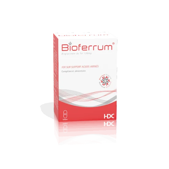 Description : Bioferrum aide à la normalisation de l’hémoglobine et de la formation des globules rouges. Bioferrum contient du fer chélaté par des acides aminés pour une meilleure absorption et une meilleure tolérance digestive. Bioferrum n’interagit pas avec les aliments (thé, café, lait … etc). Bioferrum permet aussi de couvrir les besoins journaliers en vitamine C, B6, B9 et B12. La vitamine C participe à augmenter l’absorption du fer contenu dans les aliments d’origine végétale, les œufs et les produits laitiers ce qui augmente la réserve en fer dans l’organisme. La vitamine B9 est associée à la synthèse de l’ADN, ARN et des protéines, et dans le processus de la division cellulaire et la réparation des chromosomes.