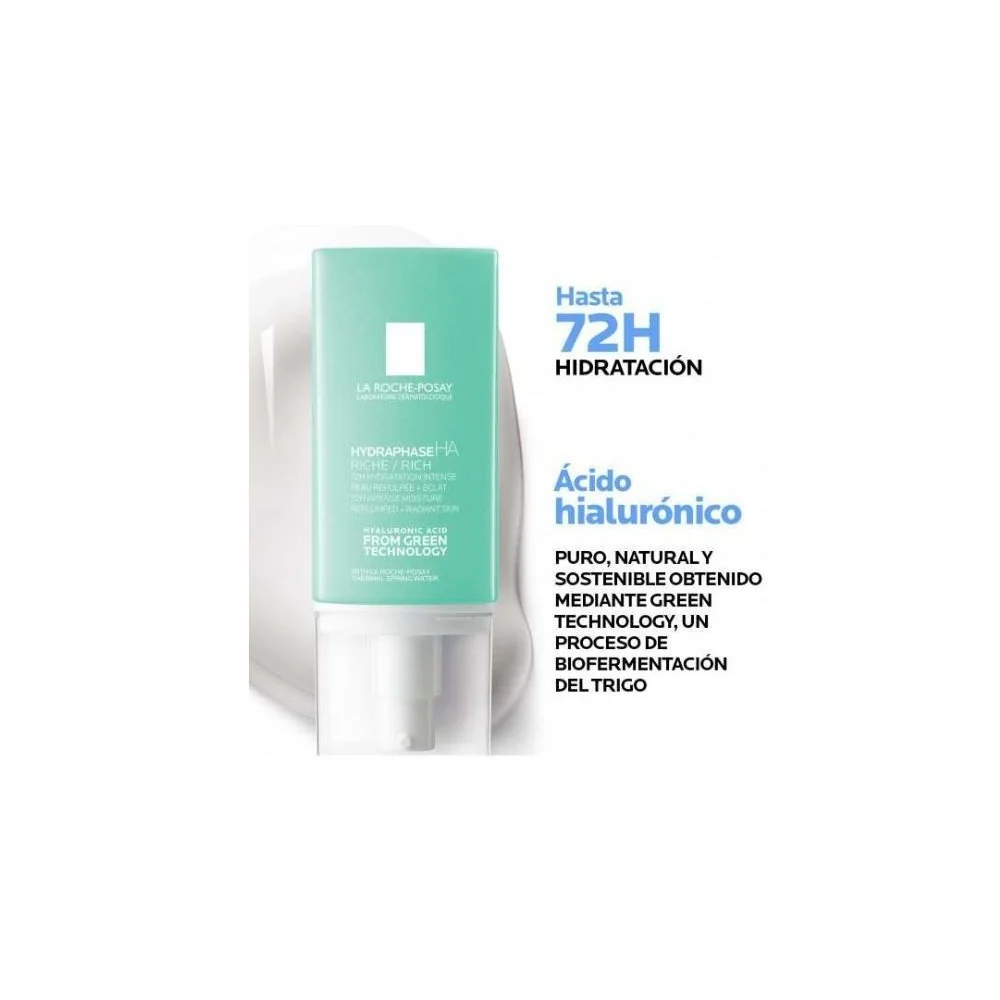 "La Roche Posay Hydraphase HA Rich dermatological moisturizing care specifically formulated for normal/dry dehydrated skin. Formulated with Hyaluronic Acid, a moisturizing molecule capable of retaining up to 1000 times its weight in water, and La Roche-Posay Thermal Spring Water, soothing and antioxidant, it hydrates and replenishes the skin with water up to 72H, improving its quality and elasticity. In addition, its Pro-Cellullar Matrix action strengthens the cutaneous barrier, preventing water loss and therefore dehydration. Proven efficacy: - Immediate hydration. 96% of women feel their skin is instantly more hydrated. - Hydration up to 72 H. The skin maintains its hydration over time, improving its quality and elasticity - Strengthens the skin barrier, preventing water loss. Expert formulation - LA ROCHE-POSAY THERMAL WATER: Soothes the skin, aiding in the natural regeneration process. Antioxidant properties. - HYALURONIC ACID: Formulated with high and low molecular weight hyaluronic acid, a powerful moisturizing active ingredient, capable of retaining up to 1000 times its weight in water. The skin is impregnated with water and the skin barrier is reinforced, retaining water for longer. Formula tested under dermatological control. Non-comedogenic. Non-greasy finish. Hypoallergenic Directions for use Apply morning and/or evening, 7 days a week - Apply Hydraphase HA rich moisturizing care all over the face after cleansing the skin. - Its light moisturizing texture favors an easy application. - If it comes into contact with the eyes, rinse thoroughly with water. - Excellent make-up base. *Self-assessment 42 women."