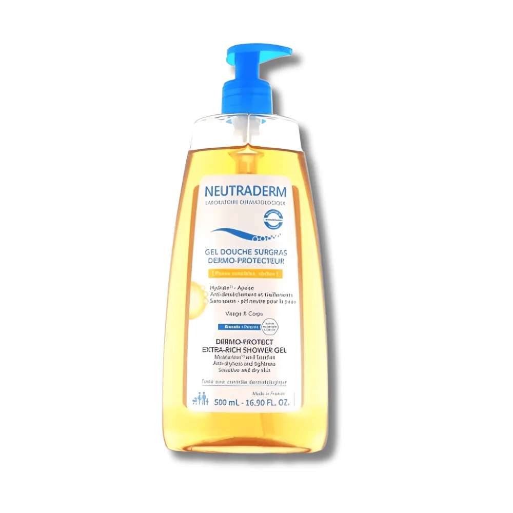 Gel douche surgras dermo-protecteur Neutraderm, idéal pour les peaux sèches et sensibles, nettoie en douceur, protège contre l'eau calcaire et hydrate la peau.