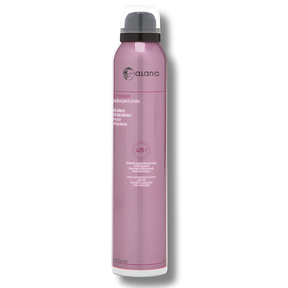 Brume antimicrobienne à parfum de rose boisée, efficace contre les mauvaises odeurs tout en respectant la peau.