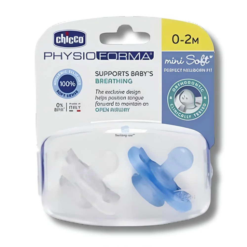 Sucettes Chicco Mini Soft : 100% silicone, finition Soft Sense, design ergonomique pour un confort optimal sans laisser de traces sur le visage de bébé.