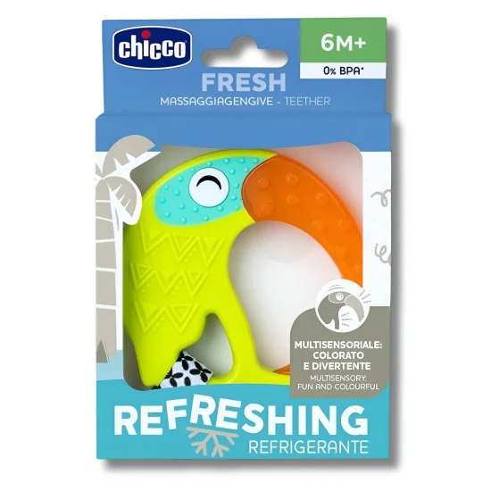 L'anneau de dentition Tucano Chicco, en forme de toucan, soulage les gencives de bébé grâce à son effet rafraîchissant et sa texture stimulante, tout en étant facile à saisir pour les petites mains.