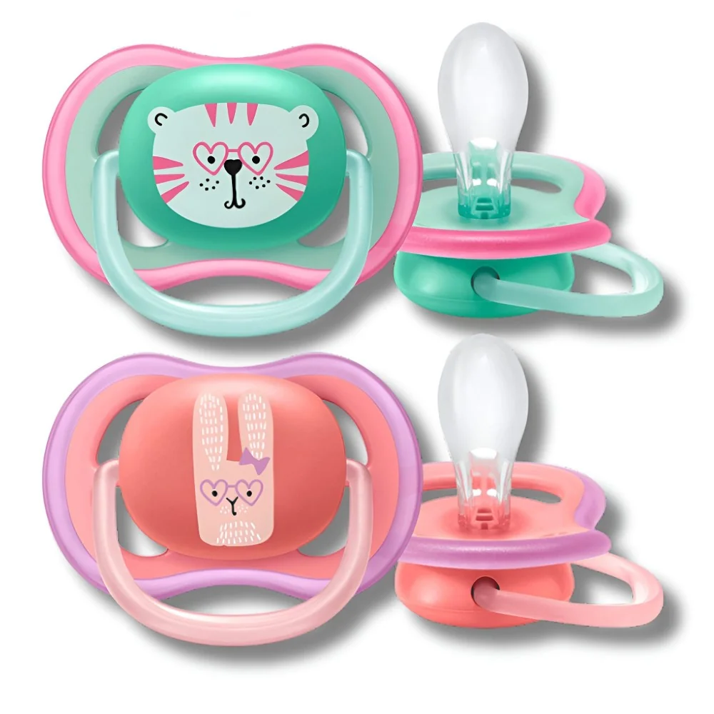 00Lot de 2 sucettes Avent Ultra Air 18M+ pour fille, avec tétine orthodontique, design respirant et sans BPA, pour un confort et une hygiène optimale.