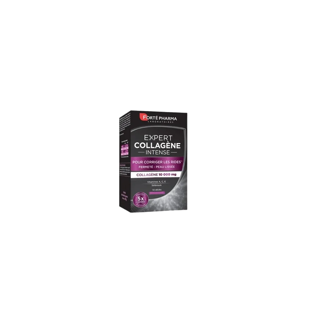 FORTÉ PHARMA Expert collagène Action anti-âge absolue Pour corriger les rides(1) avec le collagène et l'élastine Pour retarder le vieillissement cutané(2) avec ACE sélénium et la grenade Pour les rides installées Complément alimentaire 14 stick Expert Collagène corrige les rides, raffermit et protège la peau en un seul geste. Simple à utiliser, un seul stick par jour d’Expert Collagène vous apporte 2000 mg de Collactive™, un collagène marin de haute qualité dont l'efficacité a été prouvée lors d’une étude scientifique*. Associé aux oligopeptides d’élastine marine, ce complexe anti-âge aide votre peau à garder un aspect lisse et affermi(1) dès le premier mois*. Expert Collagène protège aussi votre peau du vieillissement cutané(2) grâce à un complexe anti-oxydant puissant composé des vitamines A, C, E, du Sélénium(1) et de Grenade. (1)La vitamine A contribue au maintien d'une peau normale. (2)Les vitamines C et E et le sélénium contribuent à protéger les cellules contre le stress oxydatif.