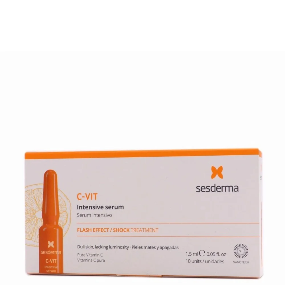 La beauté se concentre en un seul clic. Nouvelles ampoules hydratantes et illuminatrices effet flash. Sur votre peau, la vitamine C se transforme en lumière. Et cette dose de vitamine C pure et son grand effet antioxydant, hydratant, anti-rides et illuminateur redonne instantanément à la peau sa vitalité et sa lumière naturelles. Grâce à son récipient en verre topaze, la vitamine C pure est préservée en parfait état de la lumière et de l'oxygène, jusqu'à son application. Le sérum intensif C Vit est la clé pour un aspect radieux, en un seul geste. Restaurez votre peau après une dure journée de travail et soyez fabuleuse lors d'un événement après le travail, lors d'un dîner ou d'une fête de famille. Chaque ampoule est une dose de beauté instantanée, de luminosité et d'aspect sain. Indiqué pour tous les types de peau, bien que les personnes ayant la peau grasse puissent avoir besoin d'essuyer l'excès de produit avec un mouchoir juste après l'application de l'ampoule et avant de se maquiller. Avantages : Illumine et revitalise la peau instantanément. Puissant effet antioxydant et hydratant. Excellent complément des traitements dépigmentants, de la rosacée, voire de la cellulite et des vergetures, car la vitamine C stimule la synthèse de collagène.