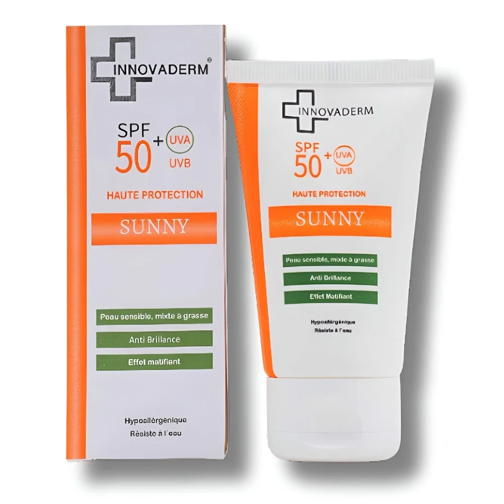 Innovaderm Sunny Anti-Brillance SPF 50+ est une protection solaire spécialement conçue pour les peaux mixtes à grasses et à tendance acnéique. Elle offre une protection immédiate contre les rayons UV tout en aidant à contrôler l’excès de sébum. Sa formule innovante sans huiles grasses procure un effet matifiant anti-brillance, tandis que sa texture légère pénètre rapidement et laisse une sensation de confort sur la peau.
