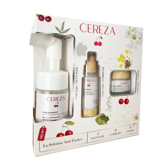 Cereza Pure Sérum corrige les taches et prévient leur apparition. Sérum lacté sublime l’éclat du teint qui redevient uniforme et lumineux Contenance : 30 ml Une mousse pour toutes types de peaux antioxydant et anti taches, nettoie et purifie en douceur Contenance :150ml Crème de nuit antitaches, unifie et affine le grain de la peau à base d’acide glycolique, Acérola, & Vinifère pour l’éclat. Contenance : 50 ml