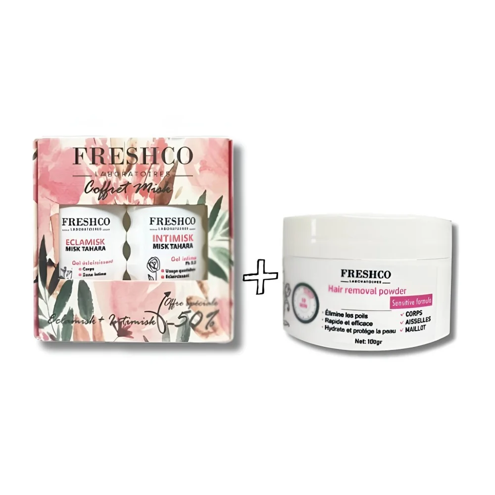 Le Coffret Intime FRESHCO est un ensemble complet pour le soin de la zone intime, comprenant trois produits essentiels : un gel intime apaisant, un gel éclaircissant et une poudre dépilatoire.