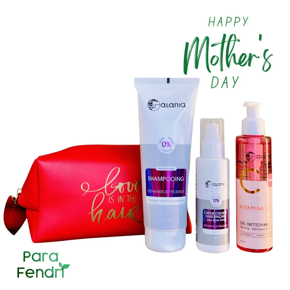ALANIA Trousse Vanity : shampooing réparateur, crème sans rinçage et gel nettoyant offert pour des cheveux revitalisés et une peau purifiée.